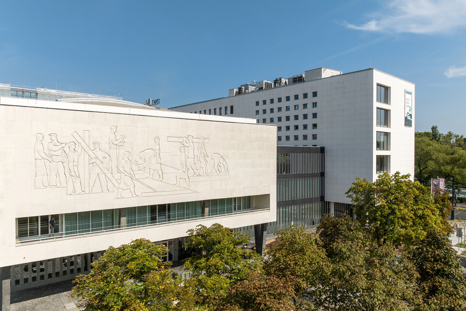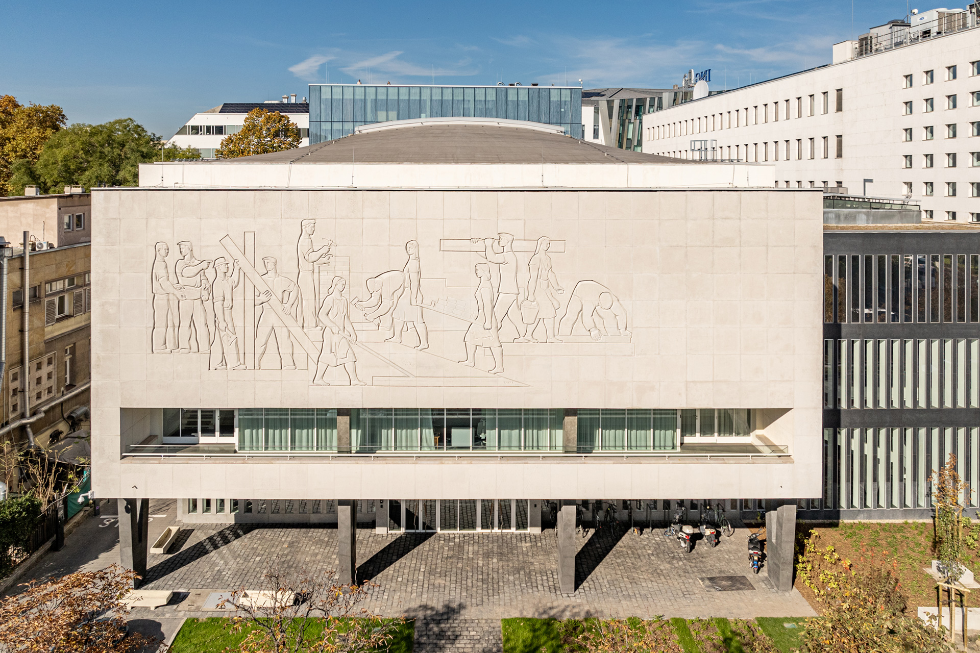Az épületen számos eredeti részlet restaurálása történt meg: többek között a műmárvány felületek, a karakteres V-tartók, a korabeli lámpák, valamint a műkő burkolatok is visszanyerték eredeti formájukat. Az Auditorium homlokzatát díszítő monumentális dombormű, Tar István Építők című alkotásának helyreállítása is különös gondossággal zajlott. A fejlesztés lezárásaként Lányi Dezső 1929-ben készült Építőmunkások szobra is restaurálva került vissza eredeti helyére a fasori bejárat elé.